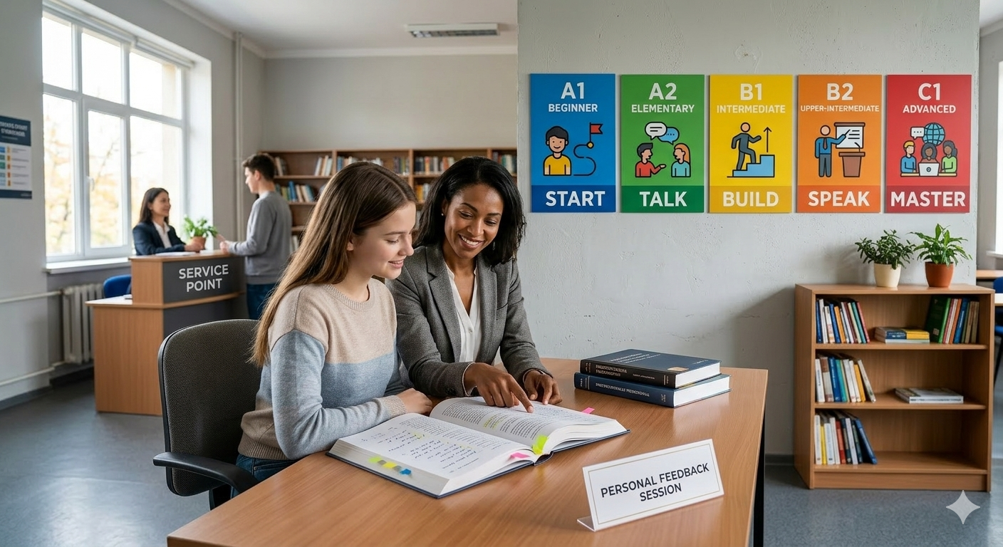 - Individueller Unterricht mit persönlichem Feedback zu Sprechen, Wortschatz und Grammatik.